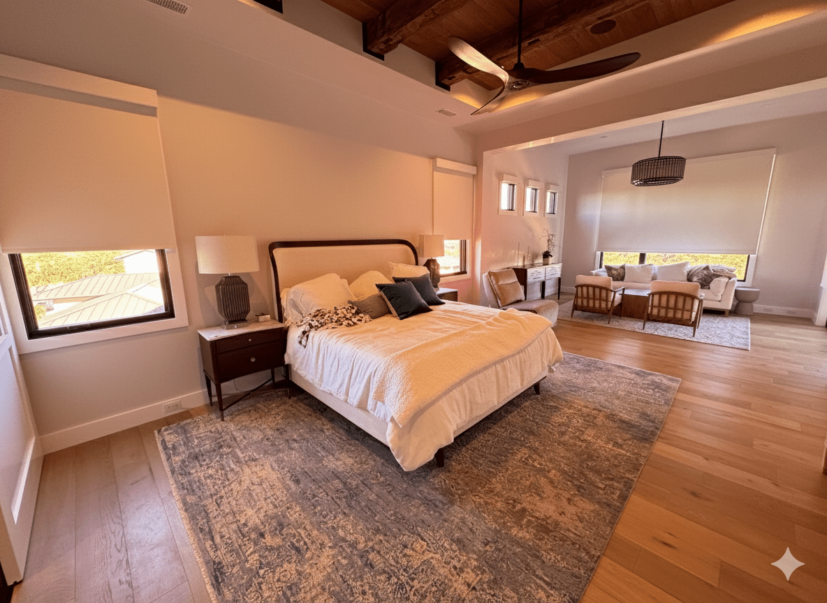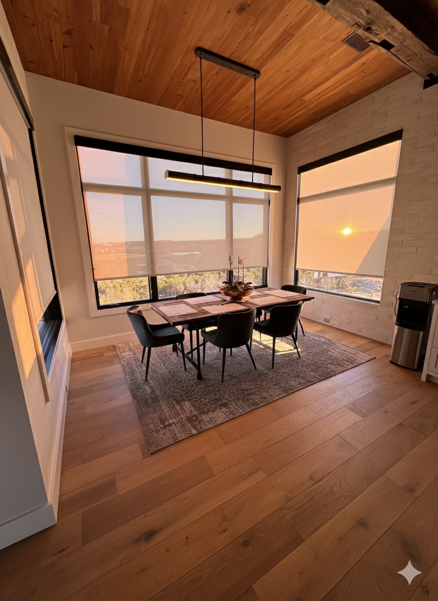 Shades played a key role in the Timberwood project — offering both beauty and convenience. Since the clients aren’t there often, remote control made it easy to manage light, privacy, and temperature from anywhere, ensuring the home is always ready and comfortable when they arrive.